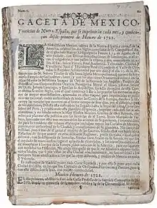 La Gaceta de México was a Spanish language newspaper published in New Spain. It was first published in 1722 making it the first newspaper to be published in Hispanic America. It was founded by Juan Ignacio María de Castorena Ursúa y Goyeneche, a journalist, Catholic priest, and later Bishop of Yucatan. He was evidently a Jesuit, as he was educated under Jesuit direction in the Colegio Real de San Ildefonso, and the Seminario de la Sagrada Compañía de Jesús de la Corte de México, and had many Jesuit associates.[1][2][3][4][5][6] He is considered the first journalist in Latin America for having created the periodical in Mexico City, whose first issue was published on January 1, 1722.[7] He was a friend of Sor Juana Inés de la Cruz, editing some of her works and defending her right to cultivate writing literature.[7]