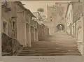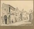 A crossroads near the rue Camollia. On the outskirts of Sienna, the banned Guelphs and the reigning Ghibellines fight. The Guelphs are led by Orso who had been banished for having dared to throw a garland to the Ghibelline Cordelia Saracini. From the battle the guelfes emerge victorious at the portcullis of the Saracini palace. Orso demands that Cordelia appear at the balcony and open the gates to the town. Cordelia replies to him: « … now is not the time to open the gates, when thieves are in the town! » Orso give orders for an assault, the gate rises and he enters the Saracini palace bent on vengeance. Rather than throw Cordelia from the window as the screaming crowd demands, he drags her half-strangled back into the palace.