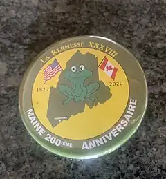 Established in 1982, La Kermesse has been a celebration of French Canadian culture in Maine with live music, games and entertainment.[5][6] In 1997, the Festival shifted to include all groups in the city.[6] Throughout its history the festival has used a green frog as it's mascot and pin-back buttons to confirm entry.[7] These buttons get changed every year and so people collect and trade them.[1][7] Fireworks are also a prominent feature of the festival.[8] After being postponed by COVID-19 in 2020,[9] La Kermesse returned in 2022.[10]