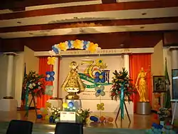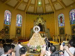 The statue was transferred in October 1954 to a new shrine built to house it inside the new Santo Domingo Church in Quezon City–the sixth Santo Domingo Church since its erection in the late sixteenth century. For this journey, devotees constructed a boat-shaped carriage (Spanish: Carroza Triunfal) to carry the image to its new home, which was declared her National Shrine by the Catholic Bishops Conference of the Philippines.[4] In October 1973, La Naval was formally declared the patroness of Quezon City, at that time the national capital. Filipino Archbishop Mariano Gaviola declared her Patroness of the Philippine Navy in 1975, a patronage invoked until this day.