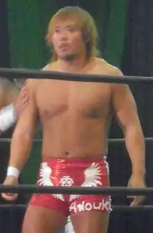 While Yujiro and Naito left Mexico for NJPW by the end of 2009 Naito returned for a series of matches in January and was later joined by NJPW rookie Taichi to keep La Ola Amarilla alive in CMLL.[11] Taichi made his Arena Mexico debut on February 19, 2010, during CMLL's Super Viernes show, teaming with Naito and Ray Mendoza, Jr. to defeat La Peste con Amour ("The Love Plague") (Máximo and Mr. Niebla) and Jon Strongman.[12] Negro Casas travelled to Japan to work an extended tour for New Japan Pro-Wrestling in April and May 2010. During the tour he wrestled several tag team matches against Jushin Thunder Liger, ending the tour with a singles match against Liger on May 3, 2010 where he lost the CMLL Middleweight Championship to Liger.[13] Over the following months Taichi and Okumura were the only two active Ola Amarilla members in CMLL, often teaming with Rey Mendoza, Jr. to round out the trio. During the April 30, 2010 Super Viernes Okumura and Taichi teamed up with Último Guerrero and Dragón Rojo, Jr. to defeat Strongman, Místico and two-thirds of the CMLL World Trios Champions El Hijo del Fantasma and La Máscara. Following the match Okumura challenged the Trios champions for a title match the following week.[14] A week later, at the May 7, 2010 Super Viernes Okumura and Taichi were joined by Hiroshi Tanahashi as they challenged for and won the CMLL World Trios Championship when they defeated Héctor Garza, Hijo del Fantasma and La Máscara for the belts.[15] At the following week's Super Viernes La Ola Amarilla lost to Máscara Dorada, La Máscara and La Sombra in a non-title match, setting up a title match for the following week.[16] On May 21, 2010 La Ola Amarilla's title reign came to an end, just 14 days after they won the belts the Japanese Trio was unseated by Máscara Dorada, La Máscara and La Sombra.[17] Tanahashi returned to Japan shortly after losing the trios championship.