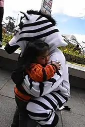 Zebras encourage safe driving behavior at pedestrian crossings and traffic lights, often through antics like lying across the hood of a car stopped in a crosswalk, in addition to more standard methods like distributing leaflets and directing traffic.[2][4] Their mission has expanded to include citizen education on topics besides road safety, such as recycling, water conservation, noise pollution, and bullying.[3] Zebras make appearances at schools, hospitals, nursing homes, homeless shelters, television shows, and street festivals.[5][2] In 2006, the program added "donkeys" as a negative counterpart to the friendly zebras; the donkeys were later discontinued.[6][7]