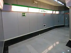 La Plata (English: The Silver) is a station of the Seville Metro on the line 1.[1] It is located at the intersection of Los Gavilanes Av. and Virgen de la Saleta St., in the neighborhood of Parque Amate. La Plata is an underground station, located between Amate and Cocheras on the same line. It was opened on 2 April 2009.