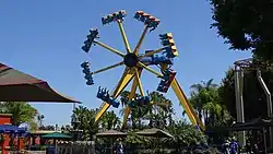 La Revolucion is a swinging Pendulum ride at Knott's Berry Farm built by Chance Morgan rides. Riders rotate 360 degrees while simultaneously swinging back and forth in a pendulum motion. The ride opened to the general public on May 29, 2003, in the Fiesta Village section of the park.[1] As the pendulum ride swings left and ride it gains speed and height with each passing cycle. In the process, riders begin to rotate 360 degrees with each passing swinging cycle. At its peak, La Revolucion swings guests 64 feet in the air.[2] The ride is positively rated for the sensation of weightiness throughout the duration of the ride.