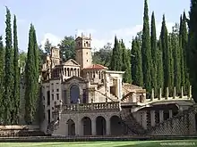 The convent lay in ruins for most of the 19th and the first half of the 20th century, when it caught the eye of the already accomplished Tomaso Buzzi. Buzzi had found success as an architect and interior designer in Milan, and was enchanted by the partially ruined site. He purchased it in 1957 and, subsequently, dedicated the rest of his life to the construction of his complex there. Buzzi restored what remained of the convent and built a large complex of buildings and theaters behind the convent mainly using stone from the convent ruins. He built seven amphitheaters of varying sizes, which represented what Buzzi thought of as the inherent theatricality of life.[3] He also built several structures and statues depicting different stages of his life,[4] such as a giant stone female torso to represent lust, and a miniature Tower of Babel to represent vanity. Many of these structures have esoteric and alchemical meanings.[3][5] Perhaps the most striking feature of the complex is the miniature city, which contains representations of buildings including Temple of Vesta, the Arc de Triomphe,[3] and the Torre dell'Orologio in Mantua. All of these elements come together to represent Buzzi's interpretation of the ideal city.[6]