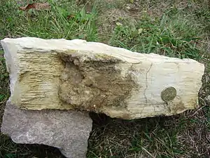 The La Tour-Blanche anticline is cored by Upper Jurassic. Lowest outcropping member is uppermost Kimmeridgian overlain by Lower Portlandian. The Uppermost Kimmeridgian is being cut by the Buffebale and can be observed in the slopes of the rivulet. It has a detrital (sandy) base and then changes into calcareous sandstones and finally into bioclastic, oolithic limestones. Two facies domains can be distinguished: a detrital domain in the east (Serie de la Marteille) and a reefal domain with single corals, occasional oysters and nerineids in the west (Serie de Cercles). This differentiation into two facies domains also persists through the Lower Portlandian, with the eastern domain showing detrital intercalations made of shelly debris, gravels, and breccias. The Lower Portlandian — generally composed of 35 m of well-bedded cryptocrystalline micrites — takes up the major part of the anticline. Its grey to yellowish, sometimes reddish beds are between 10 and 20 cm thick and are separated by thin marly or clayey layers.
