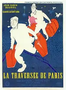 La Traversée de Paris ("The trip across Paris") is a 1956 French comedy-drama directed by Claude Autant-Lara, starring Jean Gabin, Bourvil and Louis de Funès. The film is known under the titles: "Four Bags Full" (USA), "Pig Across Paris" (UK), "The Trip Across Paris" (International English title).[2] It is set in occupied Paris in 1942 and tells the story of two men who defy the curfew to deliver pork for the black market. The film is very loosely based on the short story "La traversée de Paris" by Marcel Aymé.