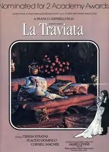 La Traviata is a 1983 Italian film written, designed, and directed by Franco Zeffirelli. It is based on the 1853 opera La traviata with music by Giuseppe Verdi and libretto by Francesco Maria Piave. Soprano Teresa Stratas, tenor Plácido Domingo, and baritone Cornell MacNeil starred in the movie, in addition to singing their roles. The film premiered in Italy in 1982 and went into general release there the following year. It opened in theatres in the U.S. on April 22, 1983. The movie's soundtrack with James Levine conducting the Metropolitan Opera Orchestra and Chorus won a Grammy Award for Best Opera Recording.