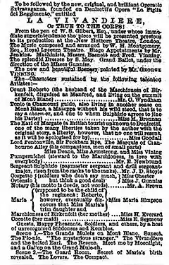 Gilbert generally followed the plot originally written for Donizetti by his librettists, Jules-Henri Vernoy de Saint-Georges and Jean-François Bayard, but allowed himself some variations. In the opera, the Marchioness's husband does not appear, but Gilbert presented him as a glum figure played by Charles Wyndham in Liverpool and Lionel Brough in London. The hero, Tonio, is not an Alpine guide in the original, and, as Gilbert made plain in the libretto, Lord Margate, the noisome English tourist, was a character "unknown to Donizetti, one of the many liberties taken by the Author with the original story."[8] One reviewer noted that "the story ... acquires a new aspect from the circumstance that all the soldiers are converted into gorgeously attired Zouaves, and all the peasants into picturesque mountaineers.[9]