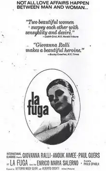 La fuga (also known as The Escape) is a 1964 Italian drama film directed by Paolo Spinola. For this film Giovanna Ralli was awarded with a David di Donatello for Best Actress.[1]