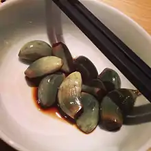 Another Laba food is Laba garlic, which is particularly popular in northern China.[11] Garlic in Chinese (蒜; suàn) has the same pronunciation as calculate (算; suàn), and it is said that on the Laba Festival businesses should balance their books and calculate their revenues and expenditures for the year.[8] Laba garlic is made by soaking garlic in vinegar.[6] Laba garlic is soaked in vinegar from the Laba Festival until Chinese New Year. The garlic and vinegar are then used alongside Chinese dumplings (jiaozi) around Chinese New Year.[5]