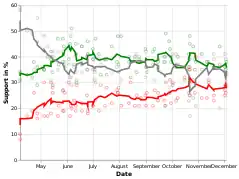 Amid the reduced popularity of the Conservatives during 2022, Labour gained a lead in the opinion polling for the next general election. Since the end of 2021, Labour consistently polled ahead of the Conservatives as the governments under prime ministers Boris Johnson, Liz Truss, and Rishi Sunak were affected by issues such as the cost of living crisis, the July 2022 government crisis, the September 2022 mini-budget, the October 2022 government crisis, and the industrial disputes.[106] By mid-October 2022, Labour were recording polling leads such as 36% against the Conservatives according to Redfield & Wilton.[107] Labour won the December 2022 City of Chester by-election, the party's best-ever result in the seat.