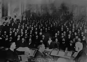 A Unity Conference was called in Wellington for April 6, 1912, to endeavour to secure the industrial and, political union of all the Labour organisations in New Zealand. It was the brainchild of American socialist Walter Thomas Mills, of Milwaukee who was accused by the far-left as a "stalking-horse for the bourgeoisie".[3] As a result, the New Zealand Socialist Party and many other radicals boycotted the conference. Those groups in attendance were representatives of the Trades and Labour Councils, branches of the New Zealand Labour Party, Trades Unions, Fabian Society, Land Values League, Young New Zealand Party, Students' Christian Association, and some other bodies.[4] Up to that time the conference was the largest and most representative gathering of progressive forces which had ever met in New Zealand. Tom Paul of Dunedin occupied the conference chair whilst Dan Sullivan from Christchurch was appointed secretary.[5]