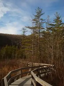 In addition to 4.8 miles (7.7 km) of trails that are maintained within the area, a 2,000-foot (0.38 mi; 0.61 km) handicapped-accessible boardwalk is available within the wetlands at the northern end of Labrador Pond. Additional accessible features include a fishing pier along the pond's western shore, and a trail to view Tinkers Falls from near its base.[10] Trails to reach the recessed amphitheater behind the falls, as well as to reach the top of the falls, were improved in 2014.[4]