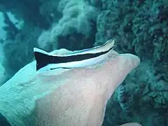 Cleaner wrasses are usually found at cleaning stations. Cleaning stations are occupied by different units of cleaner wrasses, such as a group of youths, a pair of adults, or a group of females accompanied by a dominant male. When visitors come near the cleaning stations, the cleaner wrasses greet the visitors by performing a dance-like motion in which they move their rear up and down.[8] The visitors are referred to as "clients". Bluestreak cleaner wrasses clean to consume ectoparasites on client fish for food. The bigger fish recognise them as cleaner fish because they have a lateral stripe along the length of their bodies,[9] and by their movement patterns. Cleaner wrasses greet visitors in an effort to secure the food source and cleaning opportunity with the client. Upon recognising the cleaner and successfully soliciting its attention, the client fish adopts a species-specific pose to allow the cleaner access to its body surface, gills and sometimes mouth. Other fish that engage in such cleaning behavior include goby fish (Elacatinus spp.)[10] The bluestreak cleaner wrasse is known to clean balaenopteridae, chondrichthyans, homaridae, octopodidae, and dermochelyidae.