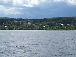 The village is located on the shores of the eponymous Lac au Saumon (French for "Salmon Lake") that is an enlargement of the Matapédia River. It was known as a spawning ground for salmon, but major pollution from mills made this a thing of the past.[1]