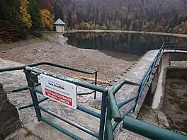 1966–1968 the lake was tightened, the dam heightened again, with a flood spillway at the left end. The old gallery was backfilled, a new bottom outlet with a valve tower built. In 2000, the dam and the lake shore were masoned, the dam top fixed with concrete.