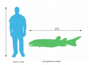 L. embryi is estimated to have been 1.8 m (6 ft) long with a wide flattened body.[5] Though only two partial specimens of the postcranial body have been recovered, L. embryi are believed to have the same body form as other species of Laccognathus.[2] L. grossi, for example, had wide and relatively short pectoral and pelvic fins arising from fleshy lobes. The caudal (tail) fin was heterocercal, with a long low upper (epichordal) blade and a rounded lower (hypochordal) blade three times as wide as the upper blade. The dorsal and anal fins were positioned close to the caudal fin.[6] The body was also covered in broadly overlapping thick scales, each roughly 2.5 cm (1 in) in diameter and ornamented at the exposed ends with small radially arranged tubercles, ridges, or both.[2]