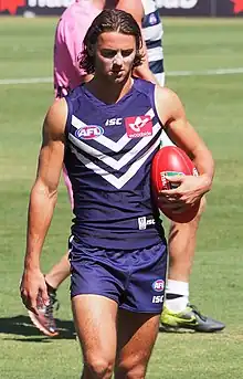 Originally from Tasmania, Weller moved to Queensland at age 15 (2011) with his family, when his brother Maverick was playing for the Gold Coast Football Club. Lachie then joined the Gold Coast Suns' junior academy development squad, but did not qualify as a priority selection due to not fulfilling the length of residence requirements.[1] During this time, he completed his schooling commitments at All Saints Anglican School on the Gold Coast and played junior football for Broadbeach as well as Southport.[2] He was drafted by Fremantle with their first selection, number 13 overall, in the 2014 AFL draft.[3]
