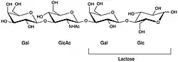Lacto-N-tetraose is a tetrasaccharide composed of four monosaccharide units in the order galactose, N-acetylglucosamine, another galactose, and glucose, joined by "1-3 β-linkages" in a linear chain.[1] It has the chemical formula C26H45NO21, shared with its related human milk oligosaccharide isomer lacto-N-neotetraose.[2] The molecule consisting of the first two monosaccharide units is called lacto-N-biose (presumably because it is a biose containing a nitrogen atom and involved in milk). and when this is attached to a lactose molecule the tetrasaccharide is called lacto-N-tetraose.[3]