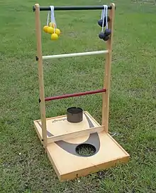 Ladder toss[1] (also known as ladder ball, monkey ball, ladder golf, ball rope, goofy balls, testicle toss, dingle balls, cowboy golf, blongo ball, and hillbilly golf and other names) is a lawn game played by throwing bolas (two balls connected by a string) onto a ladder.