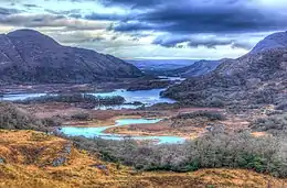 Ladies View is a scenic viewpoint on the Ring of Kerry tourist route about 19 kilometres (12 miles) from Killarney along the N71 road to Kenmare, in the Killarney National Park in Ireland.[1][2] The Irish Times ranked Ladies View as one of the most photographed places in Ireland,[3] while the Daily Edge ranked the views amongst Ireland's finest on Instagram.[4] The name Ladies View (sometimes spelt Ladies' View), stems from the admiration of the view given by Queen Victoria's ladies-in-waiting during Victoria's 1861 visit to Ireland.[5][2] In October 2017, a tourist couple almost drove their rental car over the edge of the cliff and into the valley below.[1]