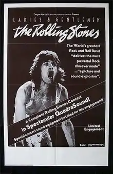 The film was shot using 16 mm film,[1][2] but blown up to 35 mm film[3] with a wet gate process for theatrical release[4] to "make it look like it was shot 35 mm for the wide screen."[2] The concerts were recorded in 32 track audio and the soundtrack was mixed in Twickenham Studios in England. In its initial U.S. theatrical run it was released in "Quadrasound" which was a variation of the four-track magnetic sound format. Instead of the usual right, centre, left and single surround tracks, Quadrasound fed right and left screen speakers and right and left (split surround) speakers. The objective of the quadraphonic sound recording was to transform the 650-seat motion picture theatre auditorium into the auditory phenomenon of a 10,000 seat rock and roll arena. The film began before most audience members even realized it: a black screen and quadraphonic audience noise fooled theatergoers into accepting the recorded ambience as coming from their own venue, intensifying the aural intimacy when the Stones began to play.