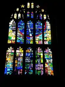 Detail of modern stained glass in the cathedral; the St Denys window