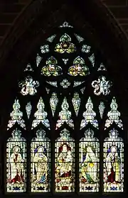 The quire is entered through a screen designed by George Gilbert Scott, with gates made by Skidmore. The rood was designed by Scott, and was made by F. Stuflesser.[4] The bishop's throne or "cathedra" was designed by Scott to complement the choir stalls. It was constructed by Farmer and Brindley in 1876. The reredos and the floor mosaic date from 1876, and were designed by J. R. Clayton. The east window has tracery of an elegant Decorated Gothic design which is filled with stained glass of 1884 by Heaton, Butler and Bayne.[44]
