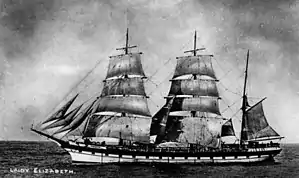 Lady Elizabeth is a wrecked iron barque of 1,155 tons built by Robert Thompson Jr. of Southwick, Sunderland and launched on 4 June 1879. Robert Thompson Jr. was one of the sons of Robert Thompson Sr. who owned and operated the family ran shipyard J. L. Thompson & Sons. Thompson Jr. eventually left the family business in 1854 to start his own shipbuilding business in Southwick, Sunderland.[2] The ship was built for John Wilson as a replacement for the 658-ton, 1869-built barque Lady Elizabeth which sank off Rottnest Island, Western Australia in 1878.[3]