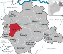 Lage (pronounced [ˈlaːgə]) is a town in the Lippe district of North Rhine-Westphalia, Germany, approximatively 8 km northwest of the administrative centre Detmold. It has 35,099 inhabitants (2016).[3] The coat of arms of Lage depicts a farmer's plough. The city is not far from the Teutoburg Forest. Due to its convenient location Lage developed into a traffic hub in the former Principality of Lippe, today's district of Lippe.