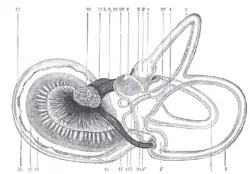 In the ear, the extremities of the ductus cochlearis are closed; the upper is termed the lagena and is attached to the cupula at the upper part of the helicotrema; the lower is lodged in the recessus cochlearis of the vestibule.