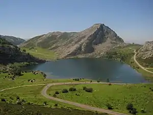The Lakes of Covadonga (el. 1134 m.) are composed of two glacial lakes located on the region of Asturias, Spain. These lakes, often also called Lakes of Enol or simply Los Lagos, are Lake Enol and Lake Ercina located in the Picos de Europa range and they are the original center of the Picos de Europa National Park, created in 1918. They are near Covadonga Sanctuary.