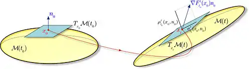 The local variational theory of hyperbolic LCSs builds on their original definition as strongest repelling or repelling material surfaces in the flow over the time interval .[1] At an initial point , let denote a unit normal to an initial material surface (cf. Fig. 6). By the invariance of material lines, the tangent space is mapped into the tangent space of by the linearized flow map . At the same time, the image of the normal normal under generally does not remain normal to . Therefore, in addition to a normal component of length , the advected normal also develops a tangential component of length (cf. Fig. 7).