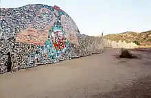 The project reached its high point in 1989 when, in celebration of the Orange County Centennial and the Sesquicentennial of the discovery of photography, the art partners erected a giant photographic mural in a critical location of the Canyon. They built this 636-foot-long mural, entitled The Tell,[2] in the Sycamore Hills area of Laguna Coast Wilderness Park.[3]