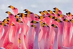Set in the backdrop of snow-covered mountains, the lake, like its neighbours, is famous for a variety of high Andean waterfowl, particularly flamingos (mostly white for the reason that algae that creates the pink colour is comparatively less in the lake waters[7]), and other bird species such as ducks and the Andean goose, and herds of vicuña are also reported. The southern lakes in the Bolivian Altiplano including Laguna Hedionda form one of the major wintering grounds for Phalaropus tricolor followed by Phoenicopterus chilensis and Phoenicopterus jamesi. On one particular date in February 1979, Phalaropus tricolor, Phoenicoparrus jamesi, Phoenicoparrus andinus and Phoenicopterus chilensis counted in the area were about one million, out of which 500,000 were reported from Laguna Hedionda and two other lakes.[1][2][5]