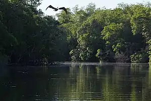 The Laguna de Manialtepec is a coastal lagoon about 18 km west of Puerto Escondido in the State of Oaxaca, Mexico. The name comes from Náhuatl “manial” (spring) and “tepec” (Hill), meaning (Hill where water is born).[1] Access to the lagoon by car is via Federal Highway 200 or by boat from Puerto Escondido. The lagoon is 15 km long with patches of leafy jungle and mangroves that reach 15 meters of height in some places .[2] The lagoon opens to the sea during the rainy season at a place known as Puerto Suelo or El Carnero.[3]