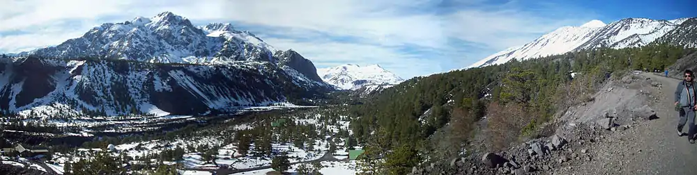 The park features spectacular mountain landscapes, whose main attractions are the Antuco Volcano, Sierra Velluda and Laguna del Laja (Laja Lake). The latter gives the name to this protected area, but it only borders the park. The park ranges in elevation from 976 m to 3585 m at Sierra Velluda.[2] Although a little snow caps Antuco volcano, much more snow adorns the two major summits of its southern neighbor, even during Chile’s summer. Sharp ridges and deep valleys carve this rugged region, which alternates between bare rock and lush vegetation.[3] Another summit in the park, although least prominent, is Cerro Cóndor at 1,668 m.[2]