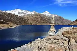 In the lake, there is an anchor pylon of Lukmanier Powerline.