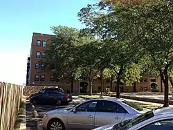 The Lake-Side Terrace Apartments is a historic apartment building at 7425-7427 South Shore Drive in the South Shore neighborhood of Chicago, Illinois. Built in 1922–23, the building is an example of a courtyard apartment, a popular apartment style in early 20th century Chicago. As the building adjoins Lake Michigan, its courtyard opens toward the lake; the courtyard is also elevated to enhance its lake view. Chicago architect Eric Edwin Hall designed the Tudor Revival building. The four-story brick building features limestone entrance and window surrounds, Tudor arched entrances to the courtyard, and a battlement along the roof.[2]