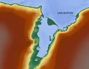 Lake Burton is located on the Ingrid Christensen Coast in Princess Elizabeth Land in Eastern Antarctica on roughly the same longitude as central India. This area of the coastline lies between Jennings Promontory, at 72°33'E, and the western end of the West Ice Shelf at 81°24'E in the western half of Princess Elizabeth Land, just east of Amery Ice Shelf. The lake is named after H. R. Burton, a biologist working in the Vestfold Hills of Antarctica.[1][2] The lake, formerly an arm of the sea,[3] is a dominant feature of the western side of the Vestfold Hills area in what is known as the Mule Peninsula.[4] The lake lies to the northwest of the Sorsdal Glacier, southeast of Oldroyd Island and southwest of the Tryne Islands. The lake has a surface area of 1.35 km2 (0.52 sq mi), a volume of 9.69 million m3, a maximum depth of 18.3 metres (60 ft) and a mean depth of 7.16 metres (23.5 ft).[5][6][7]