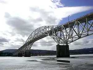In 1929, then-New York Governor Franklin Roosevelt and Vermont Governor John Weeks dedicated the first bridge to span the lake, built from Crown Point to Chimney Point.[36] This bridge lasted until December 2009. Severe deterioration was found, and the bridge was demolished and replaced with the Lake Champlain Bridge, which opened in November 2011.