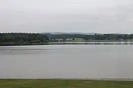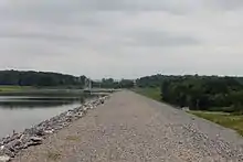 Lake Chillisquaque is dammed by an earth-fill dam known as the Lake Chillisquaque Dam.[11][12] Located on the southern side of the lake,[5] the dam is 2,000 feet (610 m) long and 54 feet (16 m) high.[11] The dam is 12 feet (3.7 m) wide at its highest point and the top of the dam forms an access road. The inner part of the dam is a silty clay material, while the outside is made of weathered shale.[11]