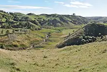 Elgood Limestone (an outcrop is in the photo - see Gallery - to the left) is part of the Glen Massey Formation. The geology guide[6] describes it as, “forming prominent bluffs or surface outcrops displaying solution channels, lapiez, and sinkholes, and is everywhere a light grey, flaggy limestone containing up to 95% CaCO3. Glauconite is common throughout, together with Mesozoic pebbles and greensand near the base”. About its late Whaingaroan (about 27 million years ago) creation, it says, “The change from estuarine, shallow brackish water conditions (Mangakotuku Formation), to fully marine, open sea, aerobic conditions (Glen Massey Formation) is evidenced by near shore accumulation of the bioclastic Elgood Limestone, onlap of the succeeding Dunphail Siltstone, and subsequent deposition of Ahirau Sandstone in an inner to mid shelf environment.”