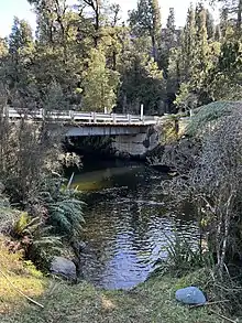 Lake Ellery is 35 kilometres (22 mi) south-west of Haast and 5 km (3.1 mi) inland from Jackson Bay / Okahu. It is accessed by a narrow unsealed road 3 km from the Arawhata River bridge, but there is no road leading to the lake shore. The only land access is by the Lake Ellery Track, an easy 30-minute walking track beside Ellery Stream, the lake's only outfall. The track leads to a picnic spot beside the south-eastern shore of the lake.[1] In 1998 maintenance of the track ceased due to lack of use, but the Department of Conservation reopened it around 2007 in response to requests by the community, and it has been recently upgraded.[2]