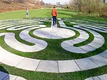 Two young children play on the labyrinth at the Lake Erie Arboretum at Frontier Park.