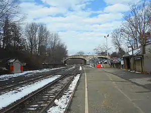 Today, the New Jersey Transit station consists of little more than two low-level asphalt side platforms, a small shelter on the westbound side, and a parking lot.[38] A shelter on the eastbound platform was demolished sometime after 2005.[18]