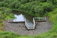 The Lake Jean Dam was constructed in the 1950s by the old Department of Forests and Waters.[7][15] The dam was earthen and replaced an older dam. This operation combined Mud Pond with what was then Lake Jean to create the 245 acres (99 ha) lake that currently exists.[15] While it has been maintained, various parts have deteriorated. In June 2015, the lake will be entirely drained to repair the dam's control tower.[7][16] It will take about two weeks to drain the lake, though a stream of water will still flow through its deepest parts. In 2015, the project was expected to cost $800,000.[7] Lake Jean was reopened in May 2016.[17]