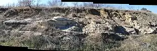 Several correlated sandstone units crop out in the immediate region. These dominate the region adjacent to the Seymour Highway, on the slopes to the south of the Wichita River (locally known as "the bluffs"). The Texas Atlas of Geology mapped these as ss6.[4] Most outcrops are buff-colored, medium-grained, well-sorted quartzose sandstones. These exhibit extensive cross-bedding and soft-sediment deformation features. Some deposits are friable, others well cemented. Locally, there appears to be three prominent layers of sandstone separated by mudstone. Because of variable erosion rates, each influences topography by forming ledges and benches, and in places may form mesa-like landforms. In and around the city, these occur roughly at 960, 1000, and 1060 feet above sea level.