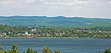 The lake is 31 miles (50 km) long with 73 percent of the lake's surface area in Quebec, where it drains into the Magog River.[3] However, three-quarters of its watershed, 489 square miles (1,270 km2), is in Vermont. The total is 687 square miles (1,780 km2), with 198 square miles (510 km2) located in Quebec.[4] In Vermont, the lake lies in parts of the towns of Derby and Newport, in addition to the City of Newport, all in Orleans County. In Quebec, the lake lies in parts of Austin, Magog, Ogden, Potton, Saint-Benoît-du-Lac, and Stanstead Township, all in Memphrémagog Regional County Municipality. The lake occupies most of what the Vermont Agency of Natural Resources calls "Basin 17".[5] At the very south end of the lake, there is the South Bay, connected by the narrowest part of the lake.